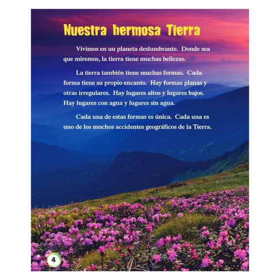 Accidentes geográficos de William B. Rice es un libro ilustrado de no ficción en español que presenta a niños de 6 a 11 años los diversos accidentes geográficos que conforman nuestro planeta. Con texto fácil de leer e imágenes vibrantes, explica accidentes geográficos como montañas, valles, mesetas, cañones, penínsulas y costas. El libro incluye un glosario, un índice y una actividad científica práctica donde los estudiantes crean accidentes geográficos con arcilla, haciendo tangibles los conceptos abstractos. Alineado con los estándares educativos, es un recurso práctico en dos idiomas para la enseñanza de geografía, ciencias de la tierra y conciencia ambiental en los últimos años de primaria.
