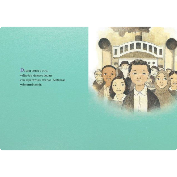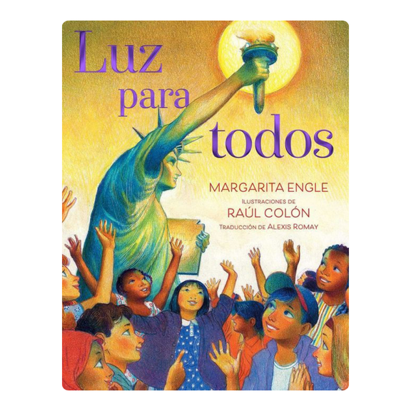 Luz para todos de Margarita Engle, ilustrado por Raúl Colón y traducido por Alexis Romay, es un libro ilustrado lírico que rinde homenaje a la experiencia de los inmigrantes en Estados Unidos. A través de un texto poético en español e ilustraciones radiantes, celebra las esperanzas, los sueños y las contribuciones de las generaciones que han llegado en busca de un nuevo hogar. El libro retrata a los inmigrantes como hilos esenciales en la vida estadounidense: diversos, decididos y llenos de luz. Para los educadores bilingües, es un recurso valioso para explorar temas de identidad, pertenencia y herencia cultural, a la vez que fomenta la lectoescritura bilingüe y la empatía en jóvenes lectores de 4 a 8 años.
