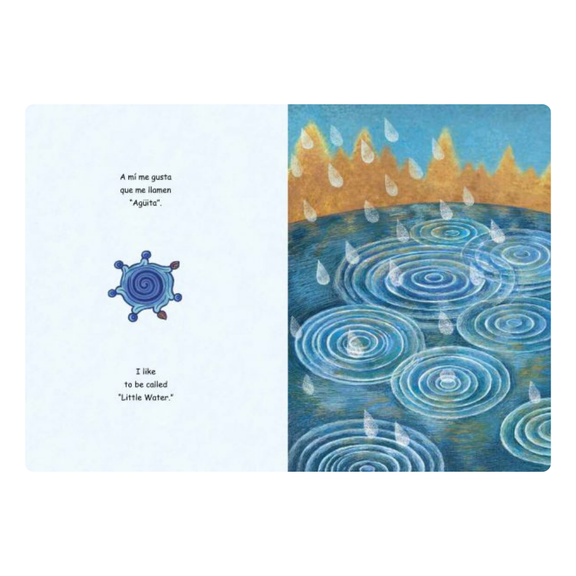 Agua, Agüita / Water, Little Water de Jorge Argueta, ilustrado por Felipe Ugalde Alcántara, es un lírico libro ilustrado trilingüe que recorre el ciclo vital del agua a través de una sola gota. Escrito en español, inglés y náhuat, comienza en las profundidades de la Madre Tierra y sigue a Agüita mientras asciende por raíces y rocas, se posa en hojas y pétalos, y se transforma en ríos, lagos, océanos y nubes, antes de regresar a la Tierra en forma de lluvia. Con un texto poético y vibrantes ilustraciones en técnica mixta, el libro celebra el agua como fuerza vital y refleja la herencia indígena pipil-nahua de Argueta. Ideal para niños de 4 a 7 años, es un rico recurso bilingüe que combina ciencia, cultura y conciencia ambiental.