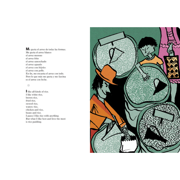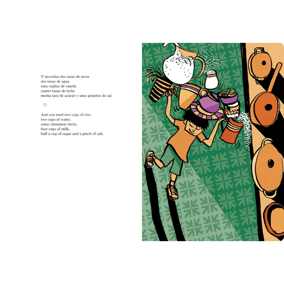Desde rociar el arroz en la olla hasta agregar una cascada de leche, canela, estrellas de sal y nieve azucarada, la receta de Jorge Argueta no solo es fácil de seguir, es una experiencia poética. Las animadas ilustraciones de Fernando Vilela muestran a un joven cocinero entusiasta que no tiene fin de alegría al hacer y luego sorber el arroz con leche con su familia.