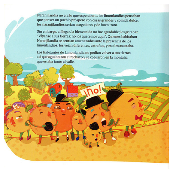 Esta es la inspiradora historia de un hermoso y próspero pueblo llamado Naranjilandia, donde sus habitantes se sentÃan felices y orgullosos de sus logros. Hasta que un dÃa, los habitantes del pueblo vecino de Limón Landia llegaron en busca de refugio. Los habitantes de Naranjilandia estaban temerosos por las diferencias con sus vecinos, entonces los enviaron a vivir en las tierras en las afueras de la ciudad. Poco tiempo después, los habitantes de Naranjilandia necesitaron de sus vecinos y fueron confortados por su generosidad. Este libro fue escrito en coordinación con AmnistÃa internacional de Chile.
