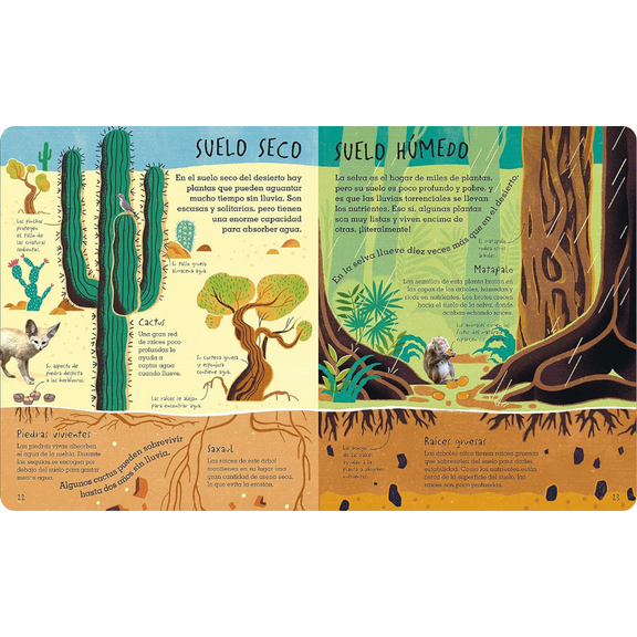 Bajo tus pies. Suelo, arena y todo lo que hay bajo tierra, de DK, es un libro de no ficción profusamente ilustrado que revela el fascinante ecosistema que se esconde bajo la superficie de la Tierra. Diseñado para niños de 7 a 9 años, explica cómo se forma el suelo, qué vive en él —desde hongos y lombrices hasta organismos microscópicos— y cómo estos elementos contribuyen al crecimiento de las plantas, el equilibrio climático y la vida misma. Con un vibrante texto en español y cautivadoras imágenes, el libro invita a los lectores a apreciar y cuidar el suelo que pisamos, convirtiéndolo en un valioso recurso bilingüe para el aprendizaje de las ciencias y la gestión ambiental.