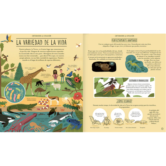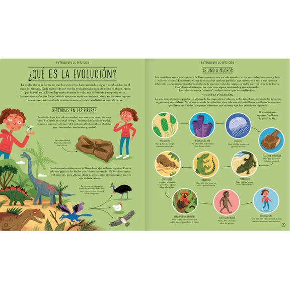 Increíble evolución de Anna Claybourne, ilustrado por Wesley Robins, es un dinámico libro ilustrado de no ficción que acerca la historia de la vida en la Tierra a los jóvenes lectores con claridad y entusiasmo. A través de un atractivo texto en español e ilustraciones audaces y coloridas, traza el viaje de la evolución, desde los primeros organismos unicelulares hasta la increíble diversidad de especies que vemos hoy, incluyendo a los humanos. El libro explica conceptos científicos complejos como la selección natural, la adaptación y la extinción en un lenguaje accesible, lo que lo hace ideal para lectores de 8 años en adelante. Perfecto para aulas bilingües, fomenta la alfabetización científica y el desarrollo del español, a la vez que despierta la curiosidad por la biología, la historia y nuestro lugar en el mundo natural.