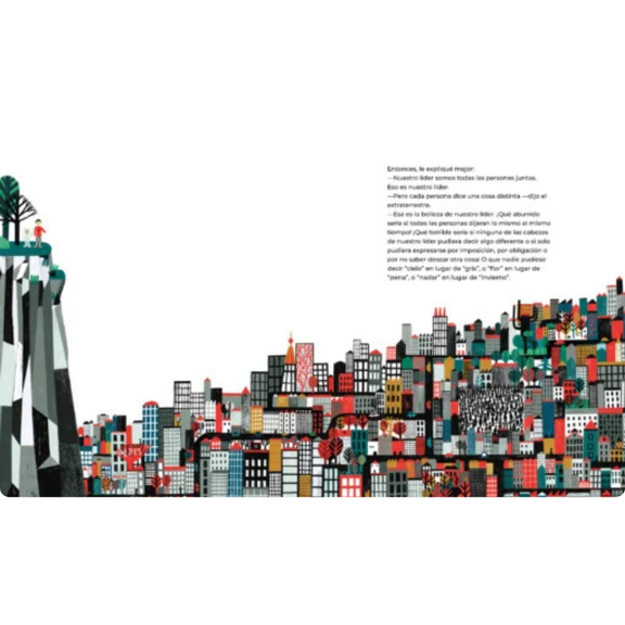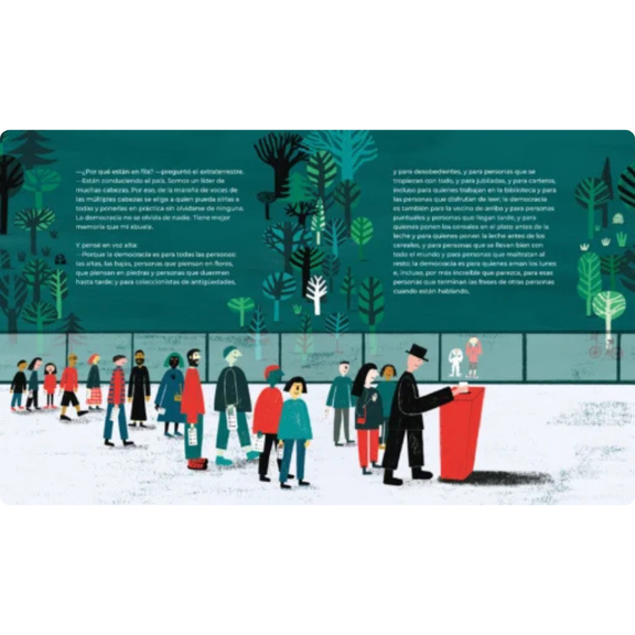Llévame con tu líder, de Afonso Cruz, es un libro ilustrado poético y filosófico que los educadores bilingües pueden usar para explorar el contraste entre la dictadura y la democracia a través de la narración en español. La narrativa se desarrolla a medida que un niño y un extraterrestre intercambian historias sobre sus comunidades, revelando cómo hacer preguntas, compartir decisiones y practicar la empatía son esenciales para la vida democrática. Las expresivas ilustraciones de Mariana Río profundizan este diálogo imaginativo, haciendo tangibles y atractivos los conceptos políticos abstractos para los jóvenes lectores. Ideal para los últimos años de primaria, este libro promueve la educación cívica, el desarrollo del vocabulario y la comprensión intercultural, a la vez que anima a los estudiantes a reflexionar sobre el liderazgo, la equidad y el poder de la voz colectiva.